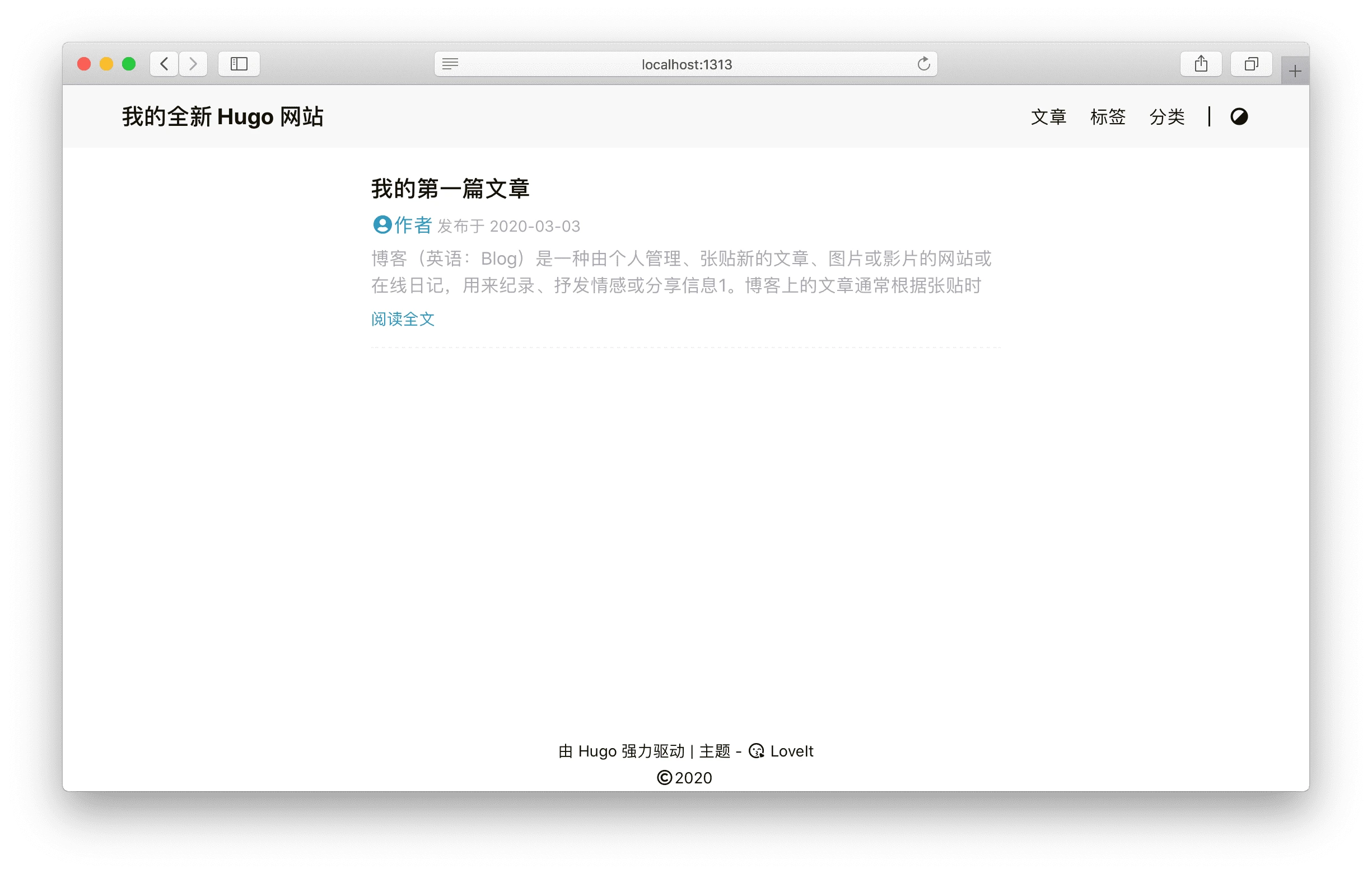 noClasses = false--theme 选项设置主题. 但是, 我建议你修改配置文件 (config.toml) 将本主题设置为默认主题.2.4 创建你的第一篇文章